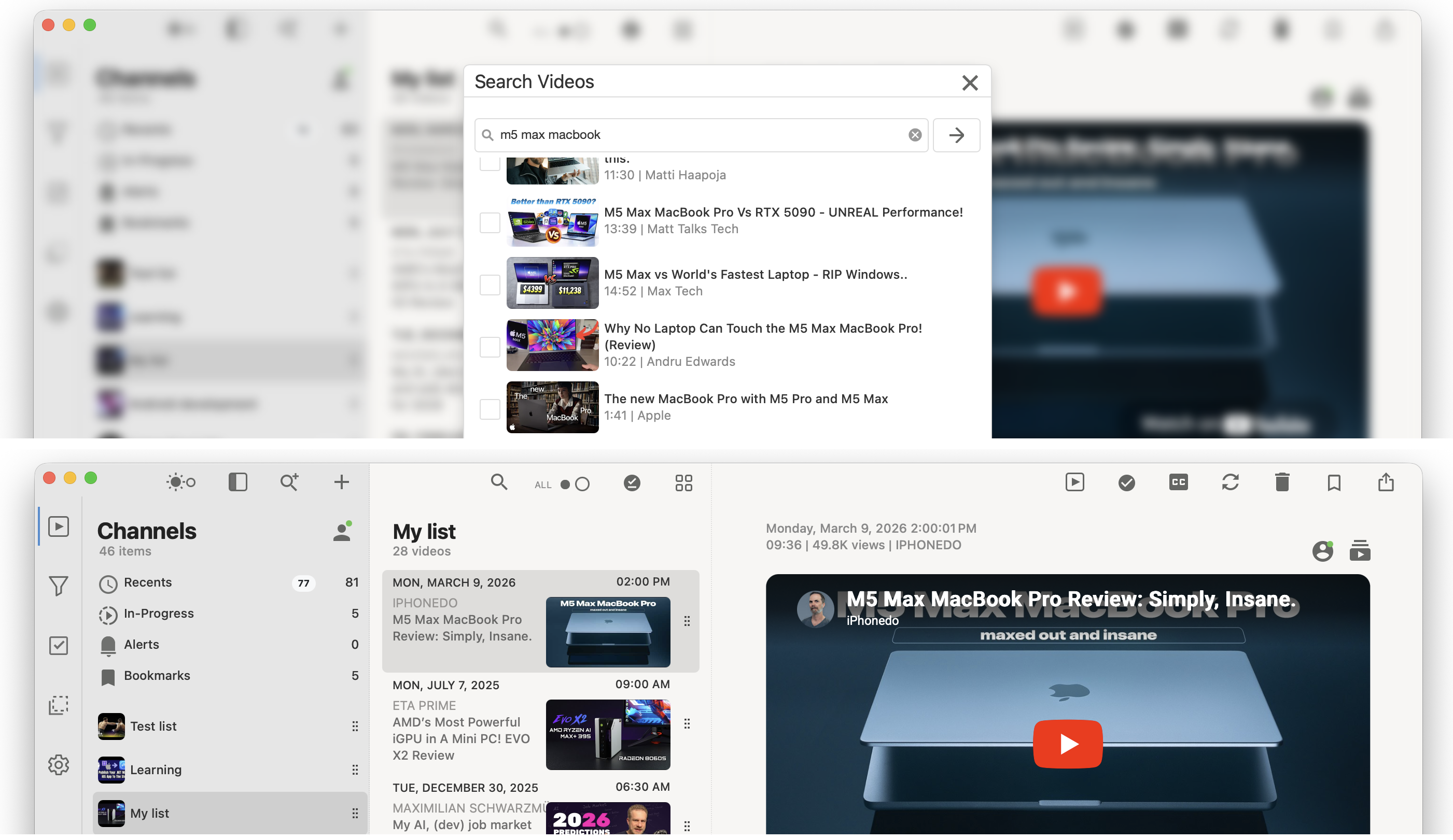 By adding channels or playlists, new videos will appear in the app as they’re released.