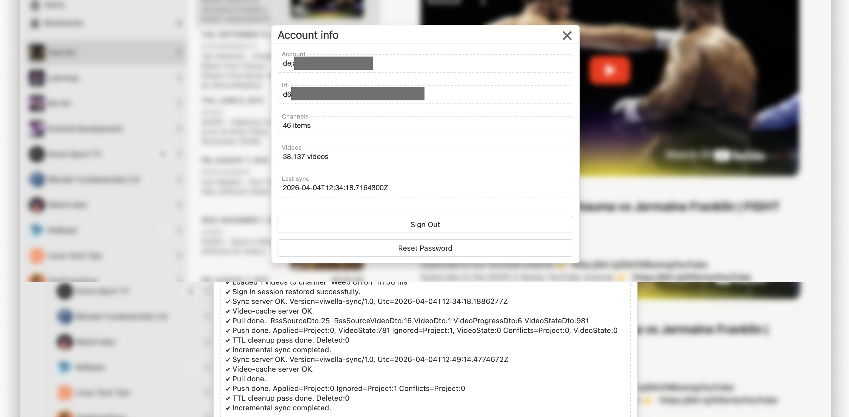 Users can sign up into Viwella account which enables sync channels, playlists, video statuses and play positions accross devices.