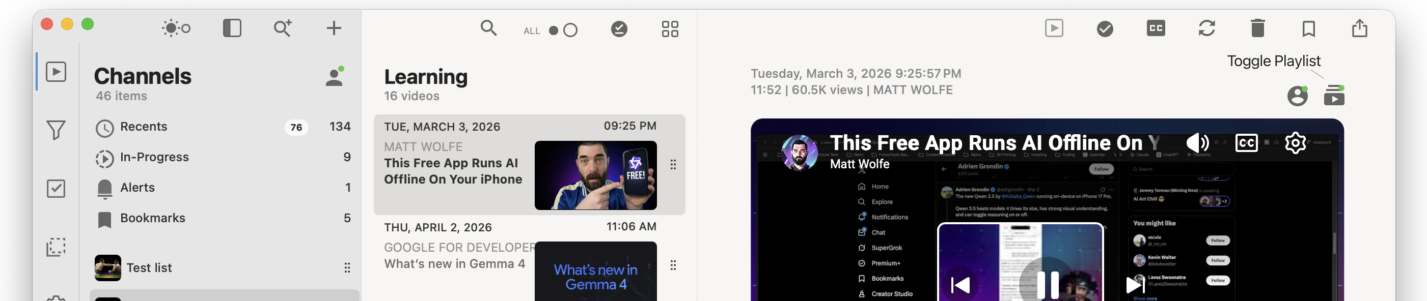 Otherwise, if a channel or playlist is selected, the application will create a new video list automatically.